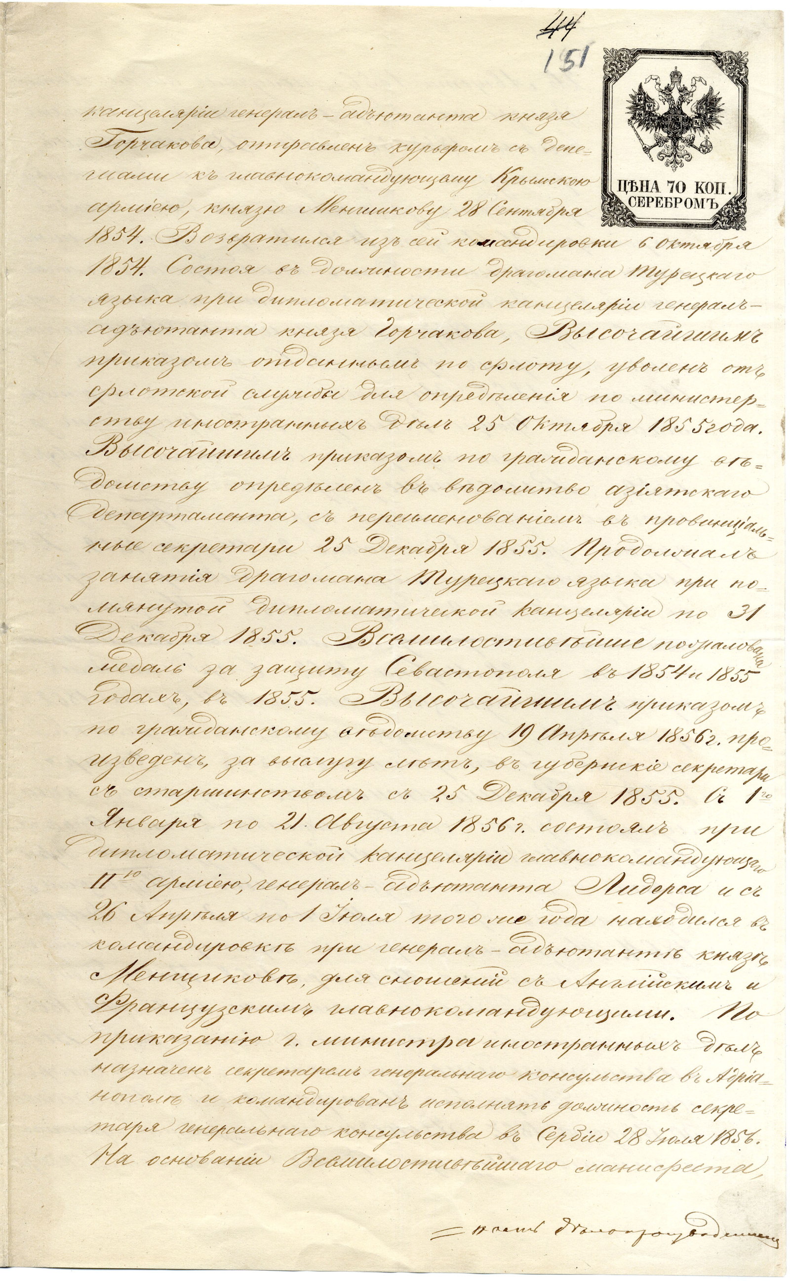25 декабря 1855 г. – поступил на службу в ведомство Азиатского департамента МИД в качестве переводчика турецкого языка, присвоен чин губернского секретаря.